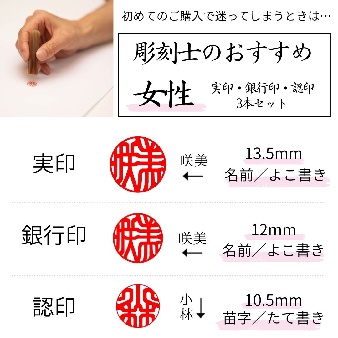 女性は実印13.5mm・銀行印12mm・認印10.5mm以上をおすすめしております。