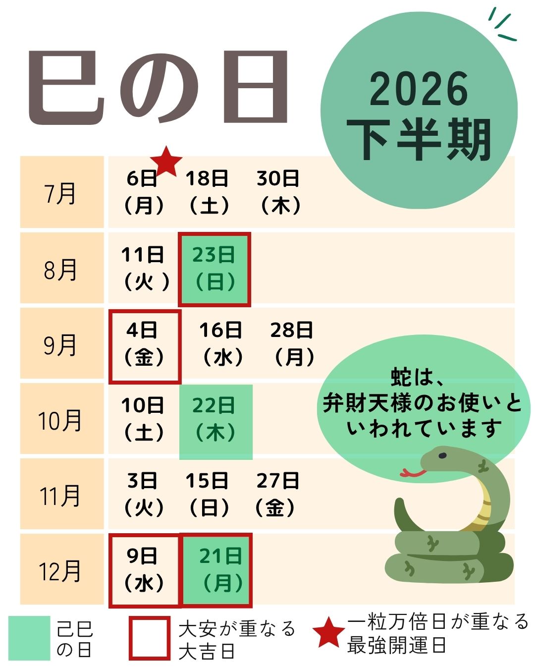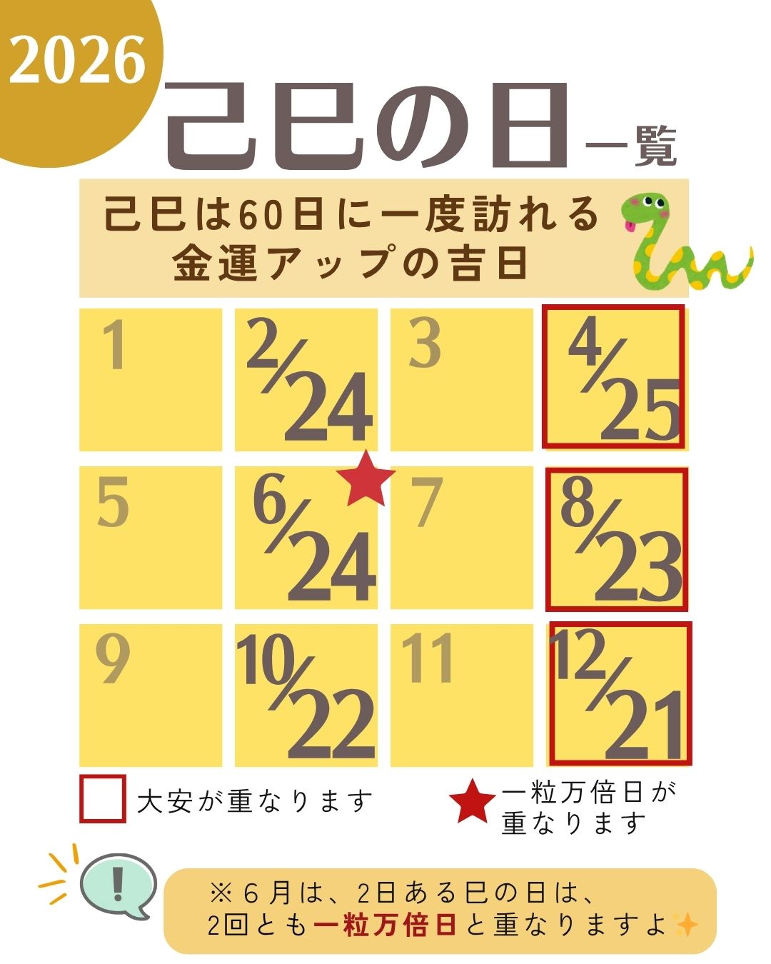 2026年の巳の日を活用して運気を高めてみてはいかがでしょうか。合わせて、さらに縁起の良い己巳(つちのとみ)の日もチェックしてみましょう。