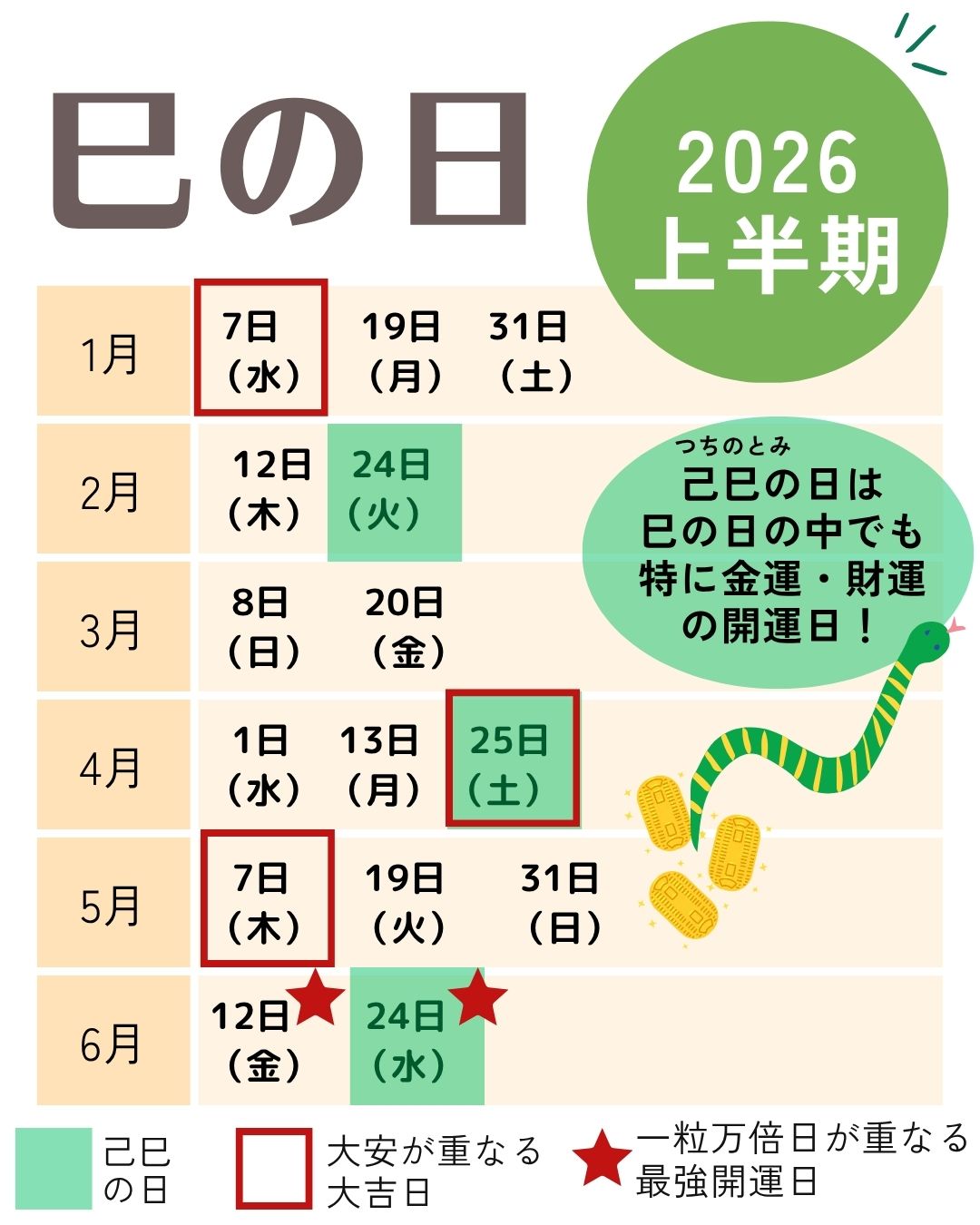2026年の巳の日を活用して運気を高めてみてはいかがでしょうか。合わせて、さらに縁起の良い己巳(つちのとみ)の日もチェックしてみましょう。