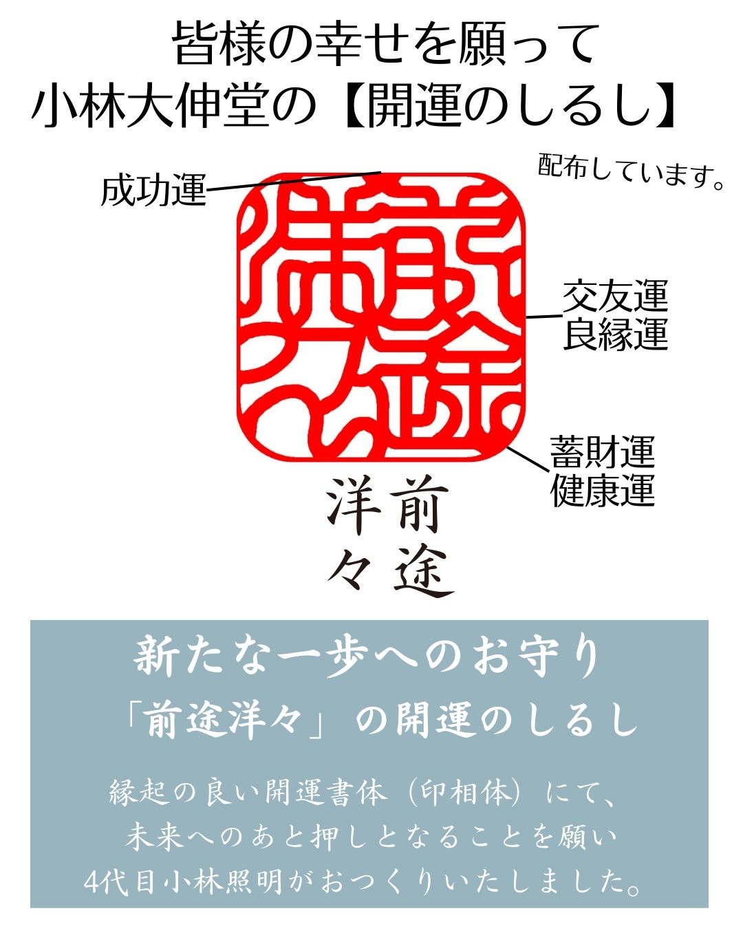 縁起の良い開運書体で、成功運、交友運・良縁運、健康運・蓄財運 の願いを込めて、四代目小林大伸堂 小林照明がおつくりいたしました。
