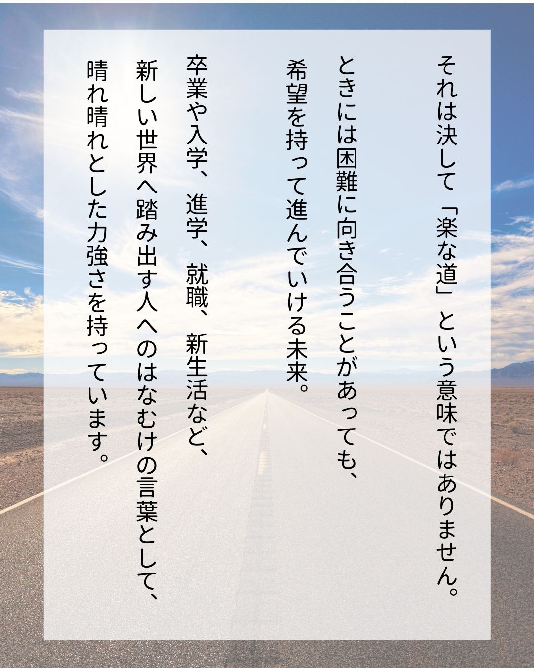 卒業や進学、就職、新生活など、新しい世界へ踏み出す人へのはなむけの言葉として、晴れ晴れとした力強さや明るさを持っています。