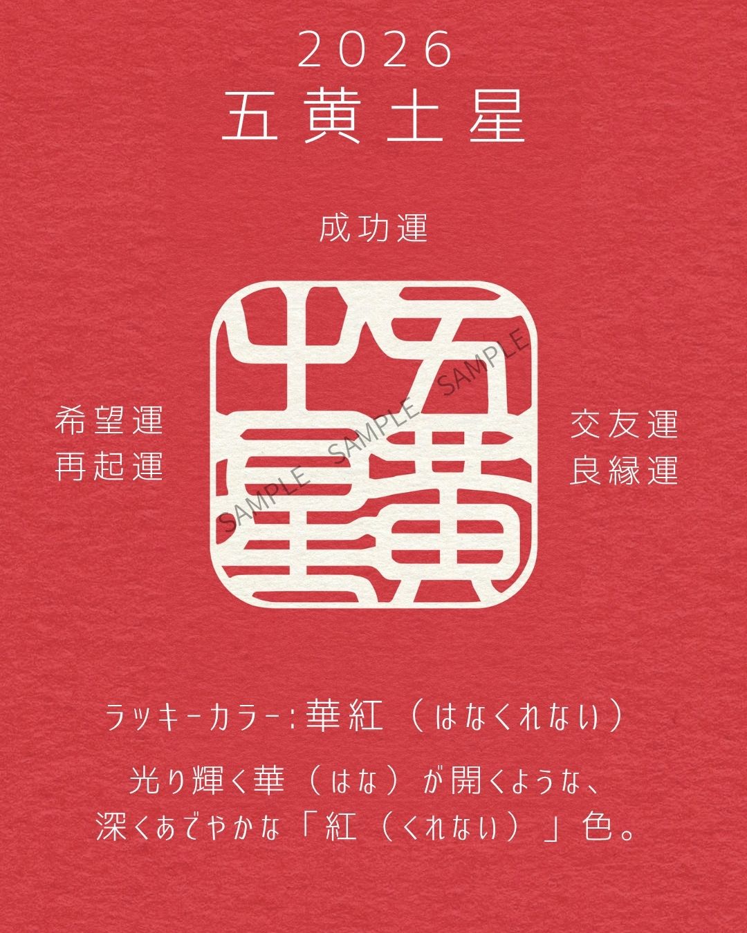 熱く力を解き放つ深紅のラッキーカラーと、目標達成をカタチにする成功運の「開運のしるし」で、輝く好機の一年となりますように。