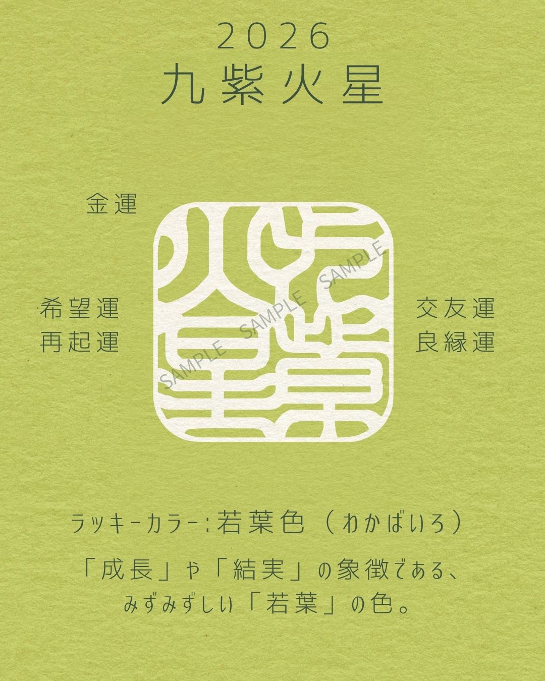 努力が実を結び、大吉運の波に乗る2026年の九紫火星さん。成長や前向きなエネルギーを象徴する黄緑色は、新しい挑戦や出会いへと軽やかに踏み出す勇気を与え、自己成長をあと押ししてくれるでしょう。