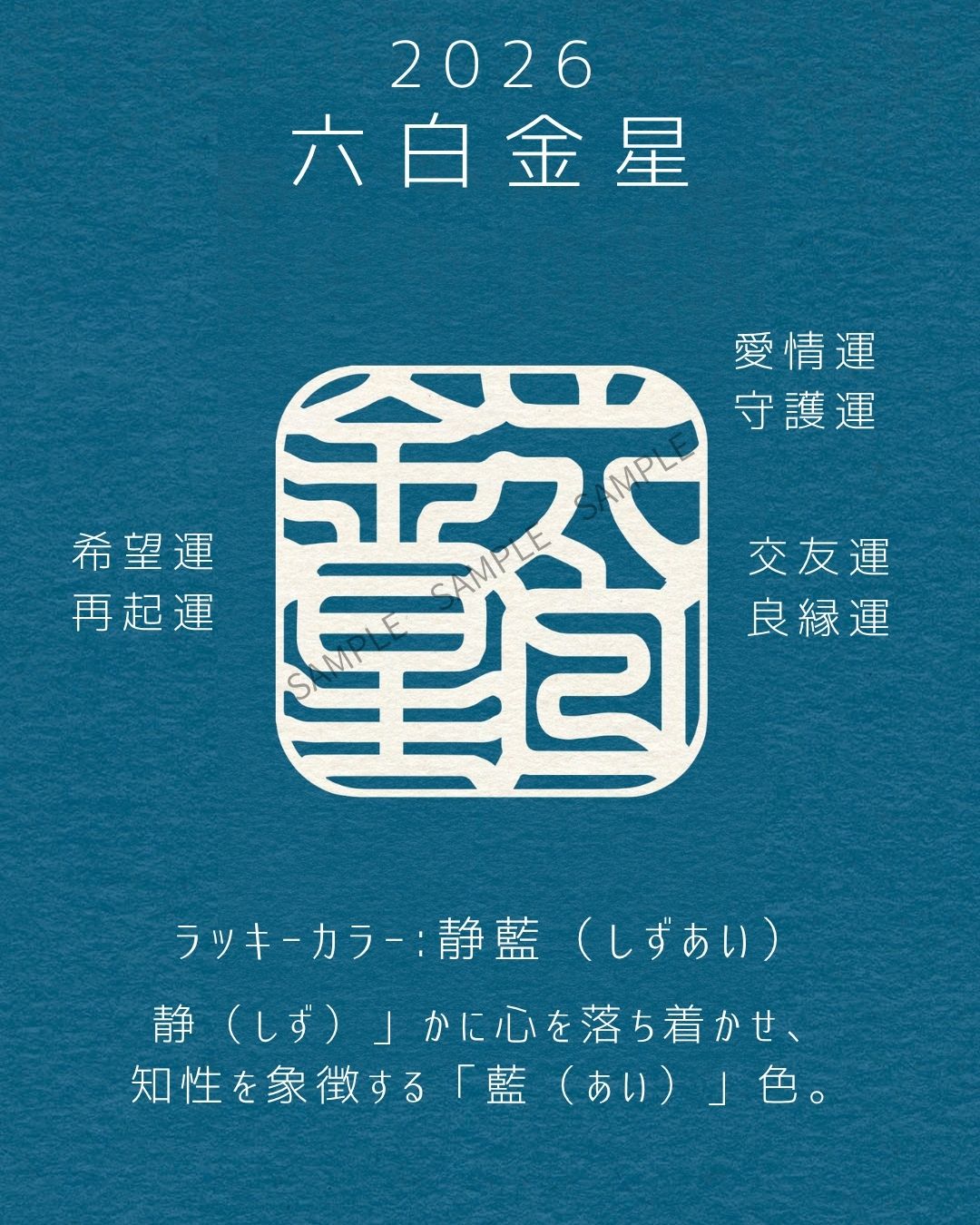地道に力を蓄える六白金星さんを支える紺色のラッキーカラーと、愛情豊かに絆を結ぶ「開運のしるし」で、力を蓄えながら糧としていけますように。