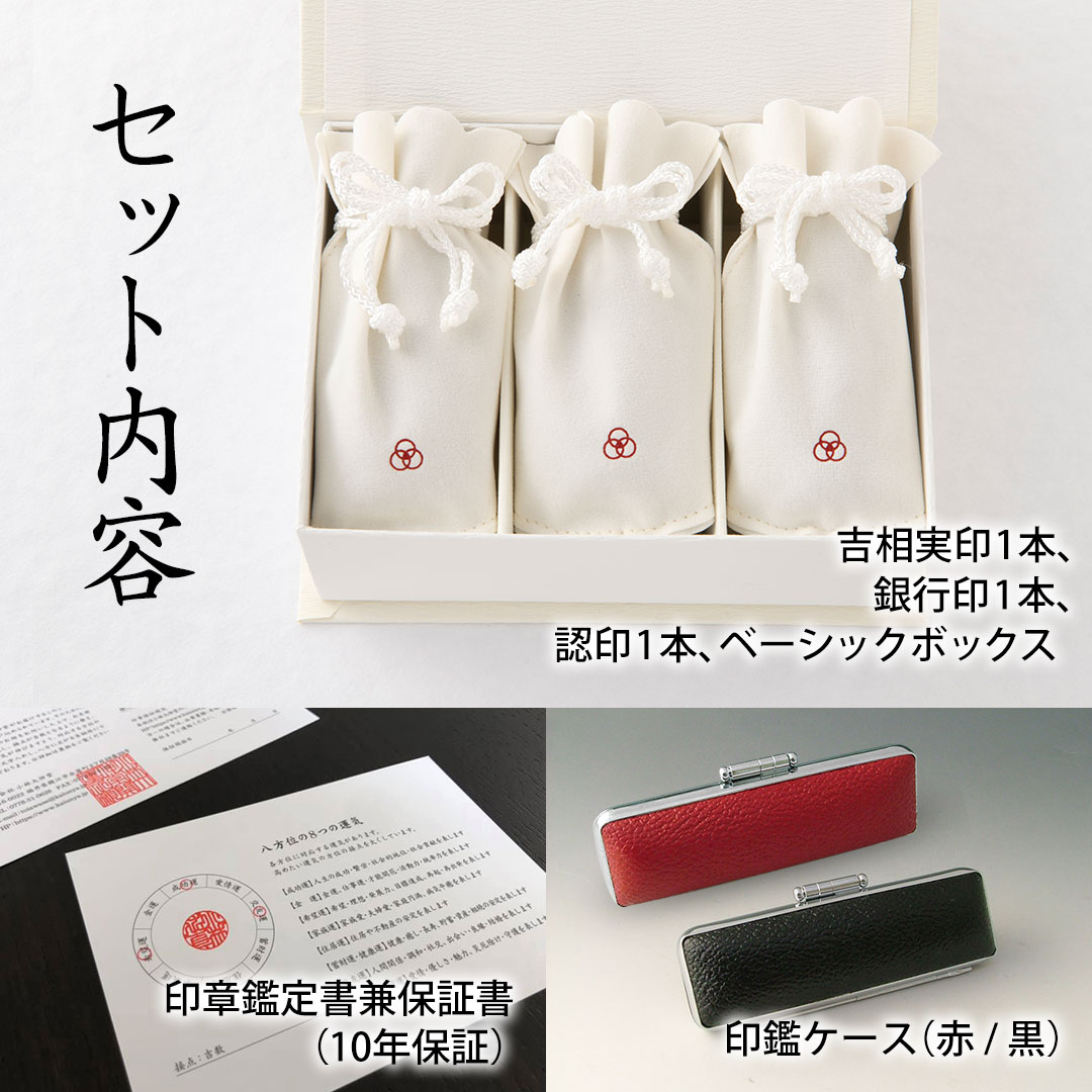 実印・銀行印・認印3本セットを生年月日・画数(姓名判断)から判断し、4代目小林大伸堂が印相体でお彫りいたします。