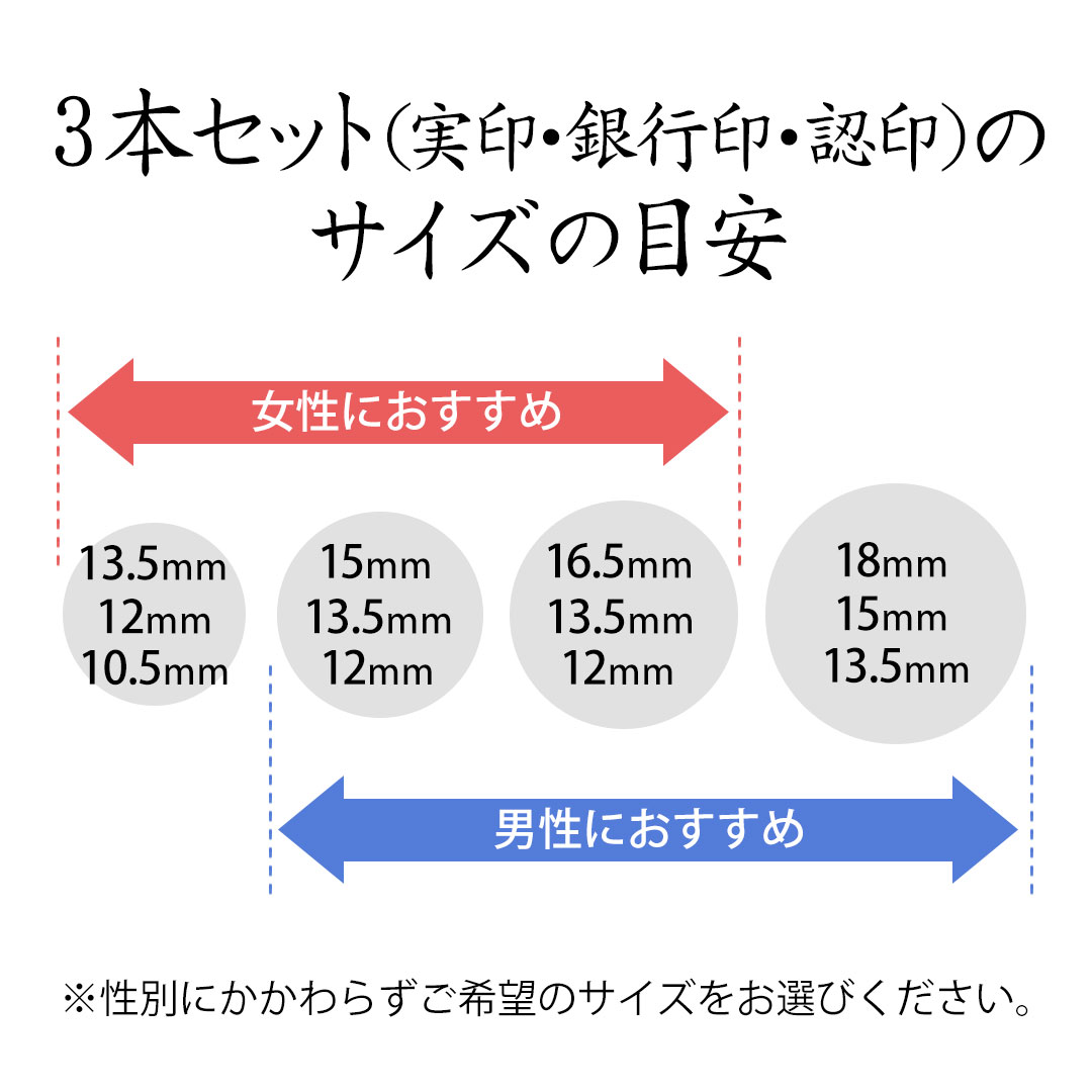 女性は実印13.5mm・銀行印12mm・認印10.5mm以上をおすすめしております。