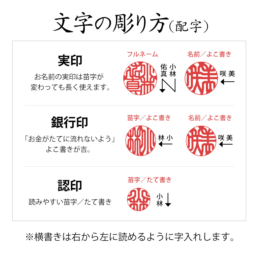 女性:実印=フルネームまたは下のお名前よこ、銀行印=苗字または下のお名前よこ、認印=苗字たて