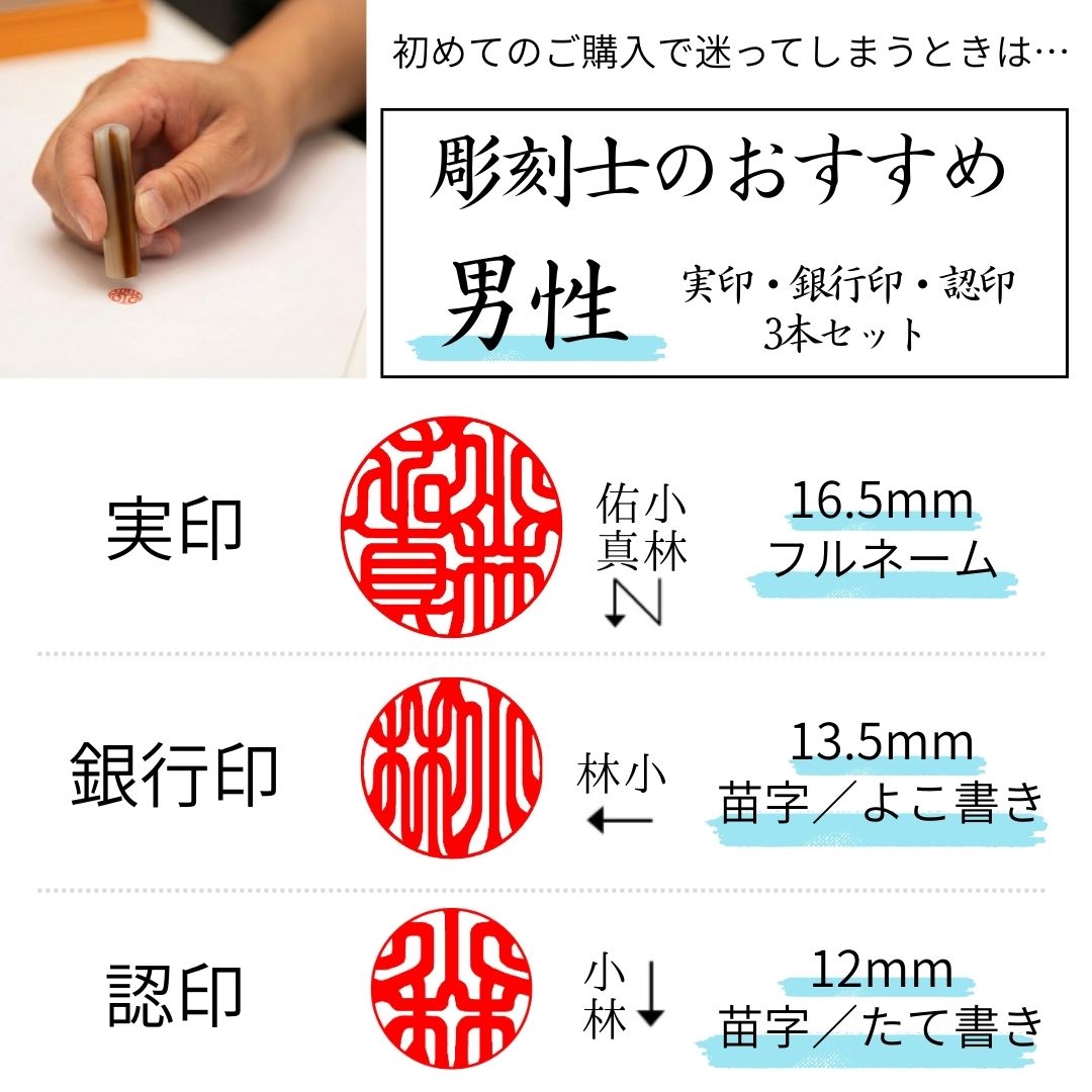 男性は実印15mm・銀行印13.5mm・認印12mm以上をおすすめしております。